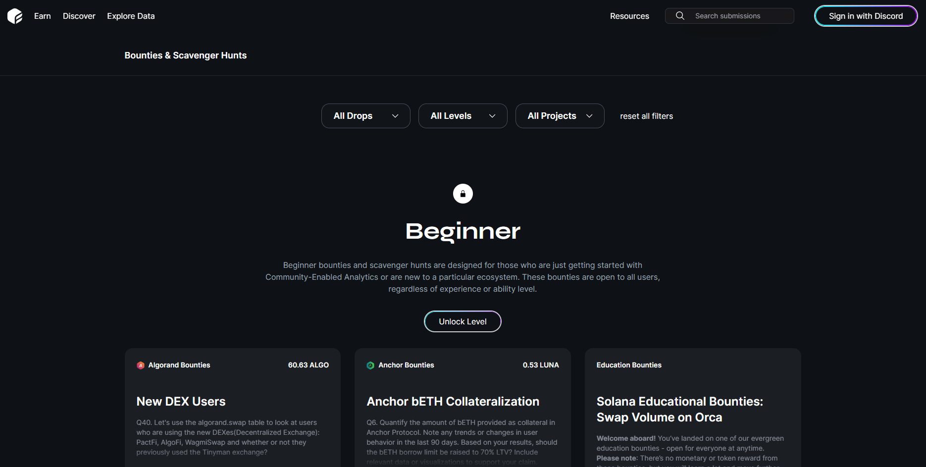 Flipside Crypto & Metrics DAO both run “bounties” for a number of blockchain projects weekly. Users answer questions and perform analysis in return for crypto payments.